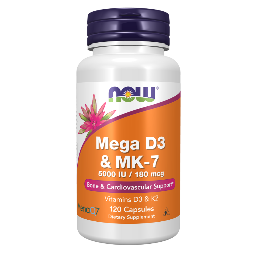 NOW® Mega D-3 & MK-7 combines vitamins D-3 and K-2, two nutrients extensively researched for their roles in the health of bones, teeth and the cardiovascular system. Vitamin D-3 works with calcium to support bone health, and more recent studies indicate it’s important for immune system health as well. MenaQ7® MK-7 is a unique soy-free, bioavailable form of vitamin K-2 that plays a critical role in arterial health through its ability to support proper calcium metabolism in blood vessels and arteries. Vitamin K-2 is also important for the formation of strong, healthy bones.