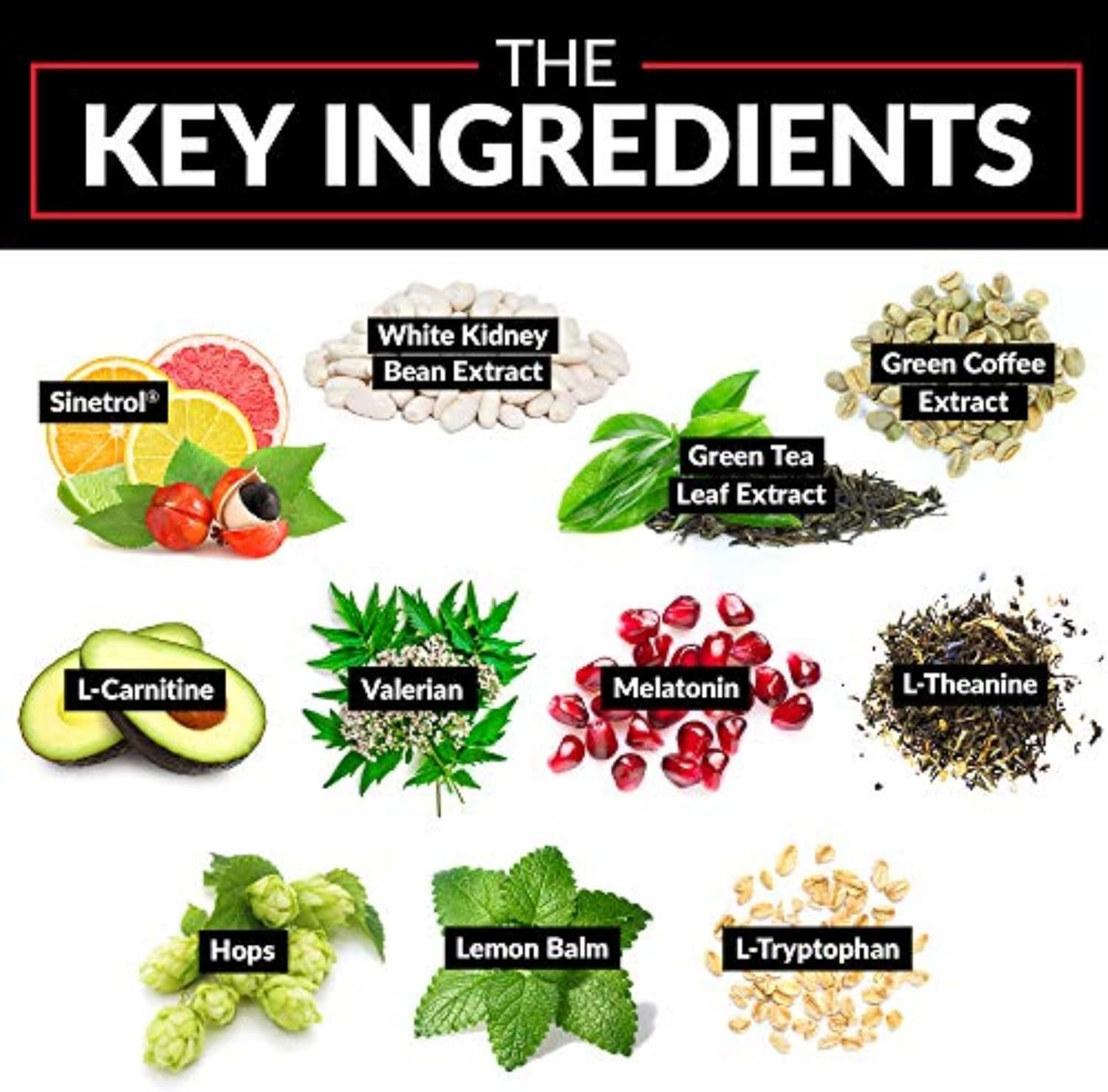 | Sinetrol® (Pomelo (Citrus grandis Osbeck)Extract (fruit), Grapefruit (Citrus paradisi Macfad) Extract (fruit), Orange (Citrus sinensis Osbeck) Extract (fruit), Guarana (Paullinia cupana Kunth) Extract (seed), Orange (Citrus sinensis Osbeck) Concentrate (fruit)), Green Coffee(Coffea robusta) Extract (bean), L-Carnitine Tartrate,White Kidney Bean (Phaseolus vulgaris) Extract (bean), Valerian (Valeriana officinalis) Extract (root),Hops (Humulus lupulus) Extract (aerial parts), Lemon Balm (Melissa officinalis) Extract (leaf), Green Tea(Camellia sinensis) Extract (leaf) (std. to EGCG),L-Theanine, L-Tryptophan, Griffonia simplicifolia Extract (seed) (std. to 5-HTP), Melatonin (1 mg) | ||