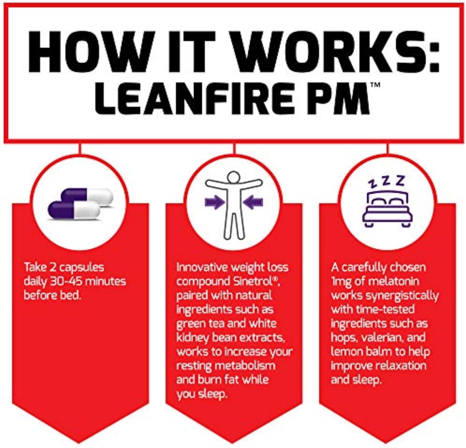 Your metabolism and sleep cycle are interdependent; studies have shown that a lack of quality sleep can lead to overeating and weight gain, which means taking stimulant-based fat burners later in the day can be counterproductive. LeanFire PM™ was engineered to stack with your favorite daytime thermo to help you burn fat overnight, meaning reaching your weight loss goals can happen even more quickly. This formula is stimulant-free, combining the latest innovations in both sleep and fat burning science so you can achieve restful sleep while simultaneously burning calories.