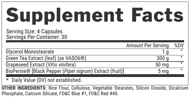 | Green Tea Extract (leaf) (as VASO6®) | 300 g | * |