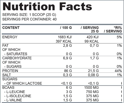 One serving (25 g) contained 22 grams of fast-absorbing, high-quality whey protein isolate supplemented with 2: 1: 1 BCAA amino acids for completeness.