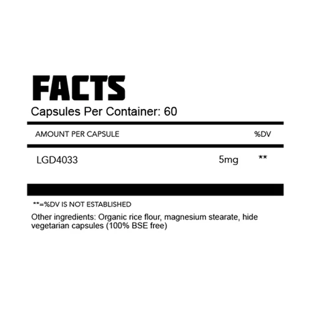 LGD-4033 (Ligandrol), Organic Rice Flour, Magnesium Stearate, Hide Vegetarian Capsules (100% BSE Free).